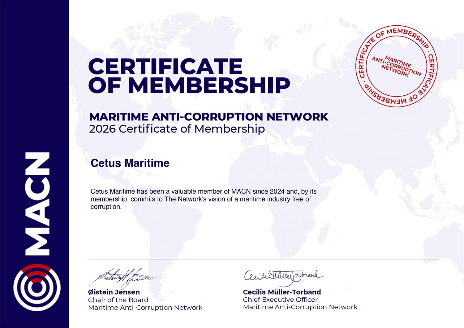 Cetus Maritime has been a dedicated member of MACN since 2024. By maintaining our membership into 2026, we reaffirm our commitment to a maritime industry free of corruption.